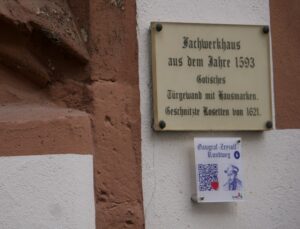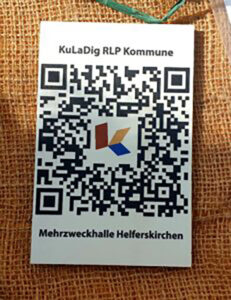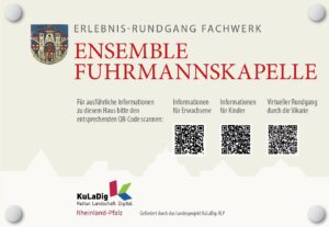 Im Stadtzentrum von Montabaur sind an den KuLaDig-Objekten (Audiotour Fachwerk zum Hören) nun solche Schilder angebracht, wie beispielsweise am Ensemble Fuhrmannskapelle. Sie enthalten QR-Codes mit je einem Audio für Erwachsene und für Kinder.