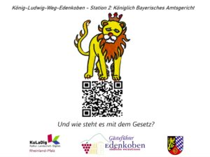 Informationsplakette mit QR-Code zu einer Audioseite der Audio-Tour „Spuren König Ludwigs I. von Bayern in Edenkoben“. Das Maskottchen des Edenkobener Löwens lenkt die Aufmerksamkeit auf das Schild und kennzeichnet alle Stationen der Audio-Tour.