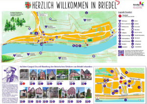 In Briedel wurden als Ergänzung zu den Plaketten an den Objekten (s.o.) große Tafeln an zwei zentralen Stellen im Ort installiert. Wie in Dörrebach enthalten diese Tafeln kurze Informationen zum Rundweg (beschreibender Text und Kartenausschnitte) sowie zu den Objekten. Ebenso erfolgt über kleine QR-Codes die Herleitung zu den digitalen Daten.