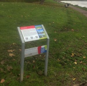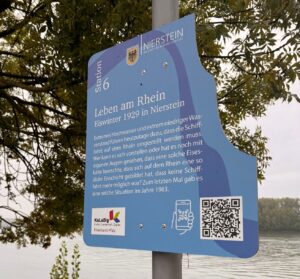 In Nierstein (Teilprojekt 2022) wurde das „Leben am Rhein“ thematisiert. Die Infoschilder sind – ganz dem Thema entsprechend – in Wellenform und in Blau gestaltet. Auf diese Weise wird durch Farbe und Form ein Wiedererkennungswert gestiftet.